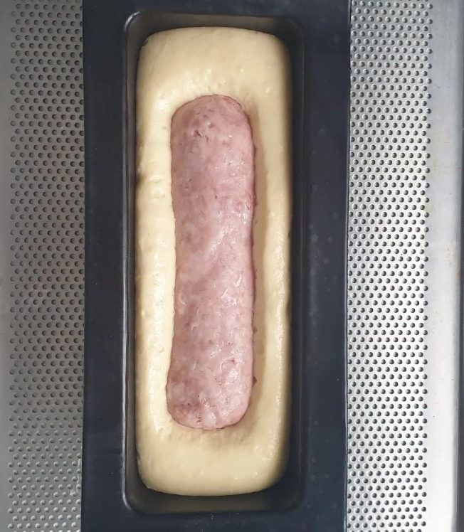 Après que la pâte ait bien reposé, étalez-la sur un plan de travail légèrement fariné en formant un rectangle. Déposez ensuite le saucisson au milieu de la pâte et repliez les bords pour envelopper complètement la viande. Veillez à bien sceller les bords afin d’éviter que le saucisson ne s’échappe lors de la cuisson.
