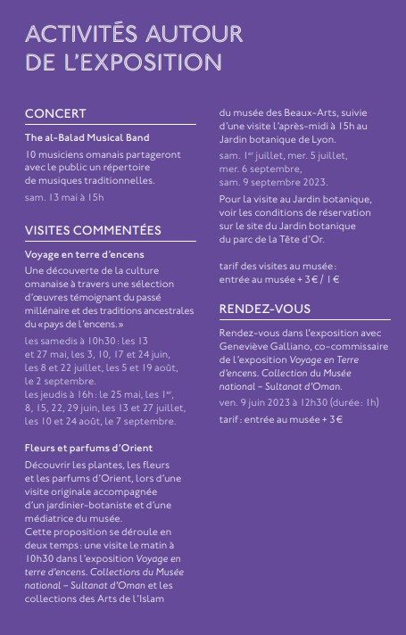 En visitant le Musée des Beaux-Arts de Lyon et son exposition Voyage en terre d’encens, vous pourrez plonger dans l’histoire et la culture d’Oman, découvrir ses trésors antiques, ses parfums envoûtants et sa beauté naturelle. Ne manquez pas cette occasion unique de voyager à travers le temps et l’espace, le tout dans le cadre exceptionnel d’un musée renommé.
